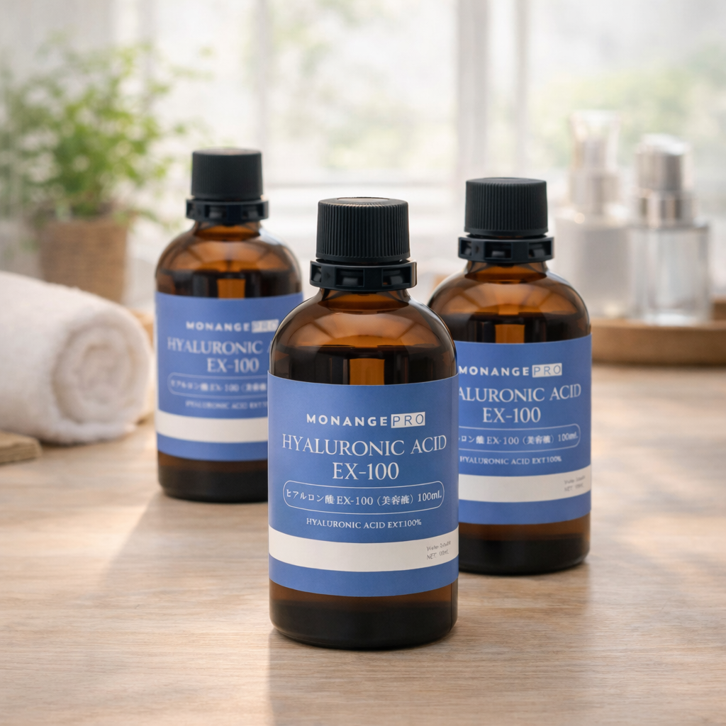 ヒアルロン酸は1gで約6リットルもの水分を抱え込む力があり、乾燥した肌に潤いを与え、ふっくらとしたハリと弾力を実現します。低分子タイプは角質層まで浸透し、保湿を長時間持続。敏感肌からエイジングケアまで幅広く使用できます。
